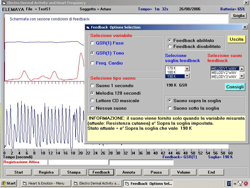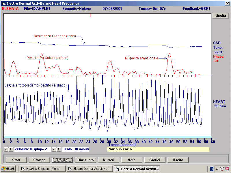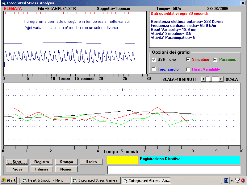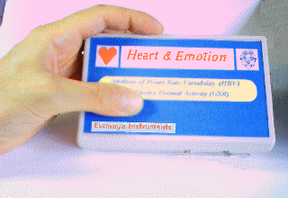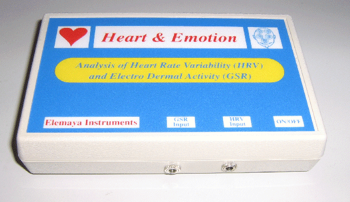 clicca qui per vedere come funziona. (Avviso: e' possibile esaminare il software solo in lettura files dati, ma e' gia' sufficente per avere una idea precisa di come funziona e cosa fa. Questo nuovo strumento di piccole dimensioni permette di monitorare in tempo reale la Resistenza Elettrica Cutanea (GSR) e la Frequenza Cardiaca, e di effettuare il test della Heart Rate Variability (HRV) Lo strumento funziona in connessione con un computer, ed e' basato su un software molto semplice ed intuitivo, che permette di osservare le risposte emozionali di un soggetto, ed i battiti cardiaci, in tempo reale, e di registrare e successivamente rileggere e stampare tutti i dati registrati. Inoltre permette di effettuare il biofeedback del rilassamento in modo facile e veloce, utilizzando un feedback sonoro di alta qualita' basato su melodie o qualsiasi CD musicale. Il Heart & Emotion non e' un apparecchio destinato a diagnosi o terapie mediche di qualsisi tipo, ma e' utilizzabile solo per il Biofeedback, per il training del Relax, e per altre applicazioni nel campo della Psicologia, inclusa la Ricerca, e per il benessere individuale.