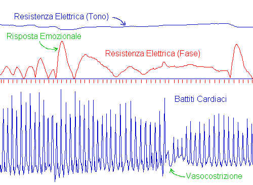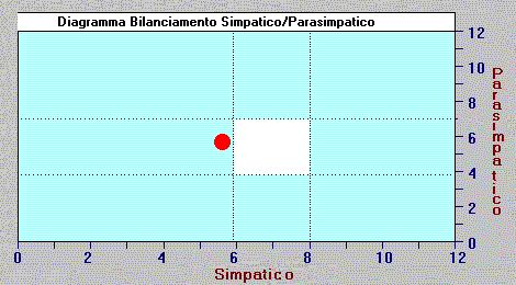 Il GSR fasico (curva in rosso) e' invece correlato con le risposte emozionali: pensieri, parole, stimoli che suscitano emozioni nel soggetto, causano un picco del GSR fasico (e' come la macchina della verita'). Il GSR Tonico e Fasico sono molto utilizzati dagli psicologi per monitorare in tempo reale le reazioni emozionali e lo stato generale di relax di un paziente durante le sedute di psicoterapia. Il battito cardiaco, invece, viene monitorato attraverso le variazioni del flusso sanguineo nei capillari delle dita (per mezzo di un sensore infrarosso), e ad ogni battito corrisponde un picco del grafico. L'ampiezza dei picchi dipende dal grado di vasodilatazione: fenomeni emozionali, o sospiri, possono causare vasocostrizioni temporanee. Il biofeedback del GSR Tonico e' invece un mezzo molto efficace per apprendere il rilassamento progressivo: l'obiettivo di questo feedback e' aumentare il valore tonico almeno oltre il valore di 200Kohms. La piu' importante e moderna applicazione della rilevazione del battito cardiaco, e' la Heart Rate Variability (HRV, descritta in questo sito internet con una intera pagina) che consente di ricavare l'equilibrio fra il sistema nervoso Simpatico e Parasimpatico di un soggetto. Questa misura dura circa 5 minuti, ed sta diventando sempre piu' importante in Psicologia perche' la HRV viene modificata facilmente da trattamenti psico-fisiologici quali tecniche di respiro e di relax, induzione ipnotica, la tecica EMDR, la tecnica Cranio-Sacrale, e molte altre tecniche miste psicologico- fisiologiche che modificano in breve tempo lo stato psico-fisico di un paziente. La misura HRV fornisce un indice chiaro e veloce se il soggetto si trova, oppure no, all'interno del range di normalita', che costituisce l'obiettivo da raggiungere con la tecnica psicologica utilizzata. Nell'esempio qui riportato, il soggetto presenta un valore (punto rosso) un poco al di fuori del range di normalita', rappresentato dalla zona bianca al centro del diagramma. Opportune tecniche psicologiche e psicosomatiche possono riequilibrare il paziente, riportando questi parametri nella zona di normalita'. Questo diagramma e' basato su valori standard definiti dalla Associazione Europea ed Americana di Cardiologia. Diverse ricerche mostrano l'importanza crescente del test HRV in ambito psicologico, cardiologico, nell'ipnosi, e nella medicina riabilitativa e sportiva. In particolare, il sistema nervoso Simpatico viene attivato nelle situazioni di stress, difesa, aggressivita', attenzione verso l'esterno. Viceversa, il Parasimpatico viene attivato nel rilassamento, attenzione verso l'interno, meditazione, con effetti contrari al Simpatico. Un soggetto normale deve poter passare facilmente da un sistema all'altro a secondo delle situazioni, e non deve (per esempio) continuare a restare in attivazione Simpatica una volta cessata la situazione stressogena. Un eccesso di attivazione del Simpatico in forma cronica, puo' portare a fenomeni di malattie psicosomatiche (ansia, ulcera, cardiopatie, ipertensione etc.) Il test HRV e' quindi di importanza notevole e sta assumendo grande importanza anche nella Psicologia, come indice obiettivo della "centratura" di un soggetto rispetto a questi due importanti sistemi nervosi che coinvolgono numerose risposte biochimiche ed immunologiche nell'organismo. Immagini del software : Cliccare sulle immagini per vederle allargate