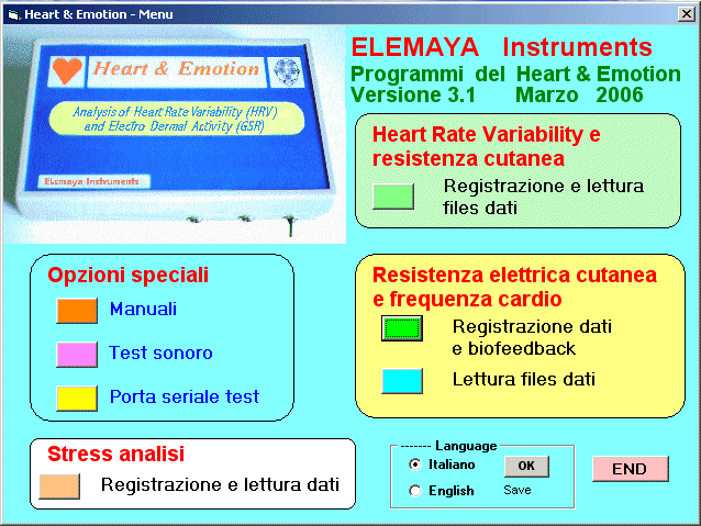 I programmi del Heart&Emotion sono molto semplici da usare: comprendono un programma per la Heart Rate Variability, un altro programma per vedere in tempo reale la Resistenza Elettrica Cutanea e la Frequenza Cardiaca, e programmi accessori, fra cui i manuali on-line, test sonoro per il biofeedback, e comunicazione con la porta seriale. Completa possibilita' di rivedere e stampare i dati registrati. E' uno dei software piu' facili e completi nel campo della psicofisiologia in Italia, con un feedback audio-visivo di elevata qualita'. E' necessario utilizzare un computer con Windows XP, Vista, Win7, Win8, Win10 con normale dotazione di almeno una porta USB oppure una porta seriale a 9 pin, microprocessore Pentium II o piu', monitor a colori. Viene fornito in dotazione un convertitore USB-Seriale per la connessione al PC. Il Heart & Emotion e' destinato alla sperimentazione nel campo della Psicologia, al training del Rilassamento, per incrementare il benessere psicofisico, per gli studi sugli stati di Coscienza, per la Ricerca Psichica anche a livello Universitario, per scopi Educativi e Culturali. Non e' destinato per diagnosi e scopi medici, cardiologici, o terapie strettamente mediche di qualsisi tipo. Per richiedere altre informazioni, scrivete a: