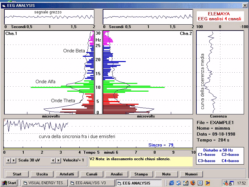 - Analisi EEG su 4 canali, con misura del livello del ritmo Alfa, Beta, Theta, Delta in microvolts,