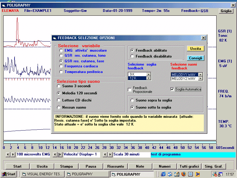 la Resistenza cutanea, e la Temperatura periferica, con possibile biofeedback sonoro su una di queste variabili.